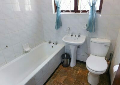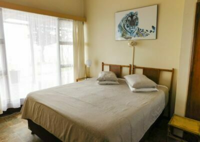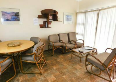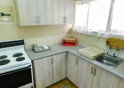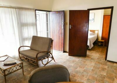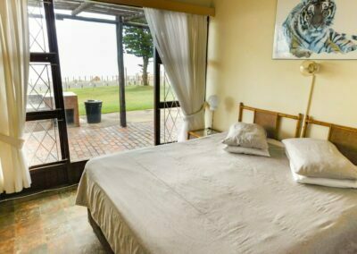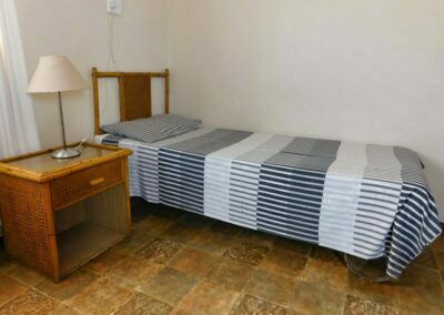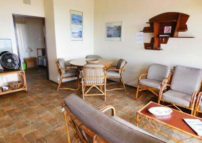 Situated in the front row of the holiday complex, this comfortable sea-facing self-catering unit can accommodate 5 guests. The first bedroom contains a double bed and has a sea view. The second bedroom is furnished with bunk beds and a single bed. The unit has a kitchen with all the basic amenities, bathroom, lounge, and patio with built-in braai.