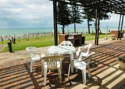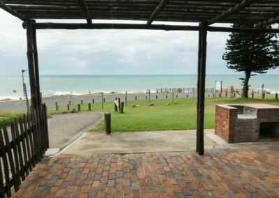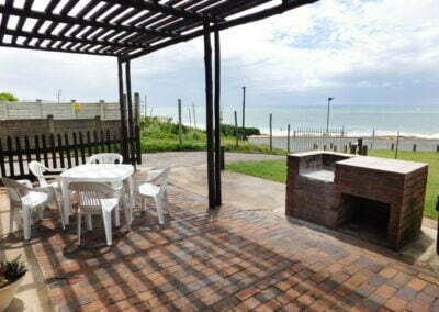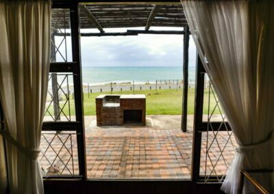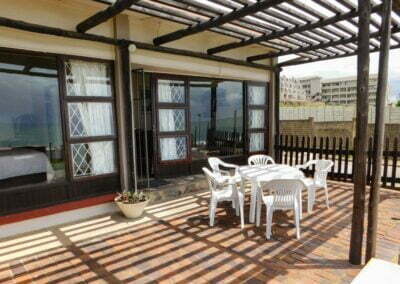The sea-facing patio has a built-in braai. Includes braai grid, tongs, and outdoor furniture (table and chairs).