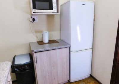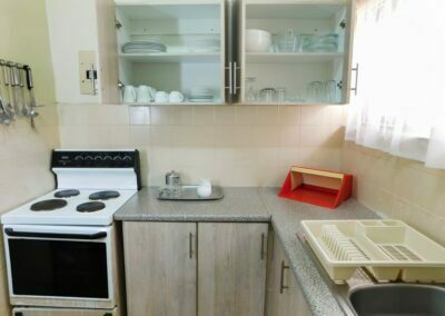 Equipped with a stove, fridge, microwave, kettle, cutlery and crockery.