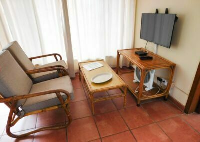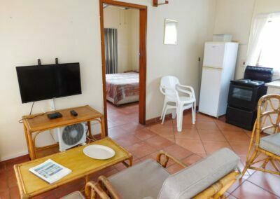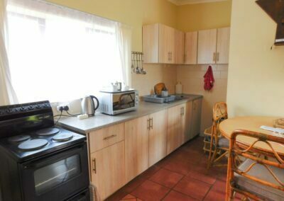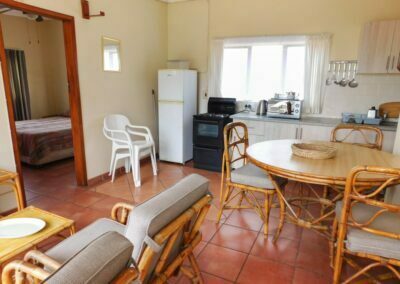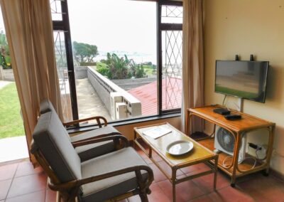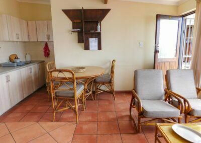 Situated in the second row of the holiday complex, overlooking the braai area, this comfortable sea-facing self-catering unit can accommodate 2 guests. The unit has a bedroom with an en-suite bathroom, open-plan lounge/kitchen with all the basic amenities, and outdoor braai facilities.